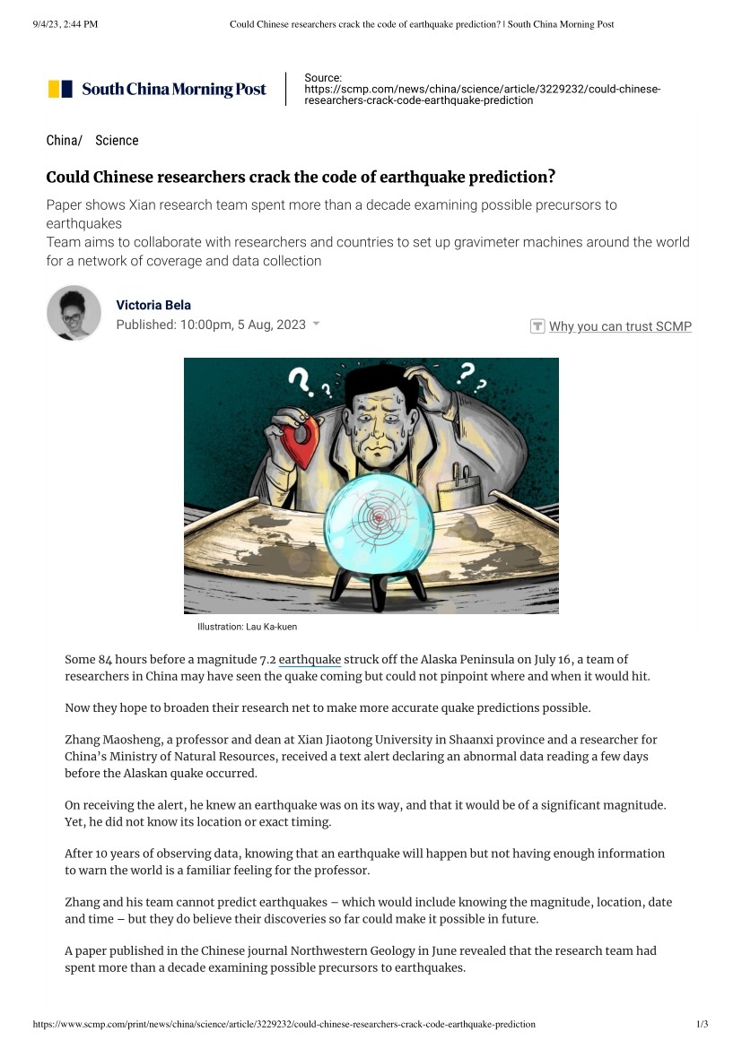 近日,国际最有影响力的周刊之一《Focus》(焦点周刊)、香港销量最高的英语报纸《South China Morning Post》(南华早报),相继以《中国研究人员能破解地震预报密码吗?》和《破解地震预报学》为专栏,报道了张茂省团队的研究成果《基于动态重力信息的地震前兆与强震短临预报》。