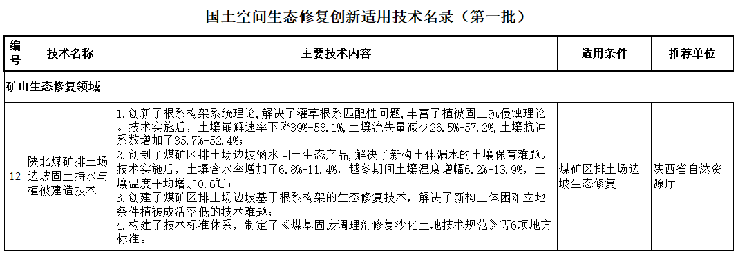 近日,自然资源部发布了全国首批31项国土空间生态修复适用技术目录,我协会与榆林学院矿区生态研究团队共同申报的“陕北煤矿排土场边坡固土持水与植被建造技术”成功入选。该项技术依托陕北矿区生态修复重点实验室,结合陕北受损境实际,创新了根系构架系统理论,创制了煤矿区排土场边坡涵水固土生态产品,创建了煤矿区排土场边坡基于根系构架的生态修复技术。这项技术的逐步推广应用可进一步促进陕北矿区生态修复作,为区域环境保护、经济发展提供技术支撑。